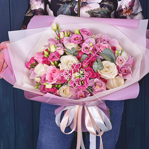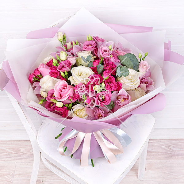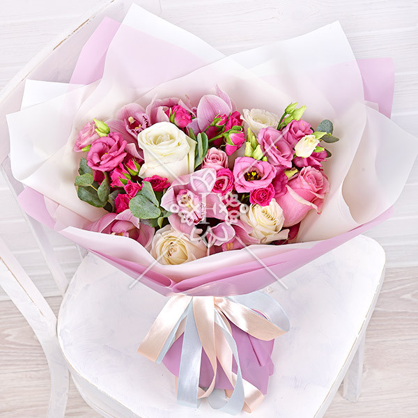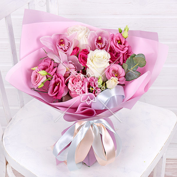 орхидея сиреневая – 3 шт., роза  белая – 2 шт., роза розовая –1 шт., роза розовая кустовая – 1 шт., эустома розовая – 2 шт., зелень декоративная (эвкалипт), упаковка, лента.